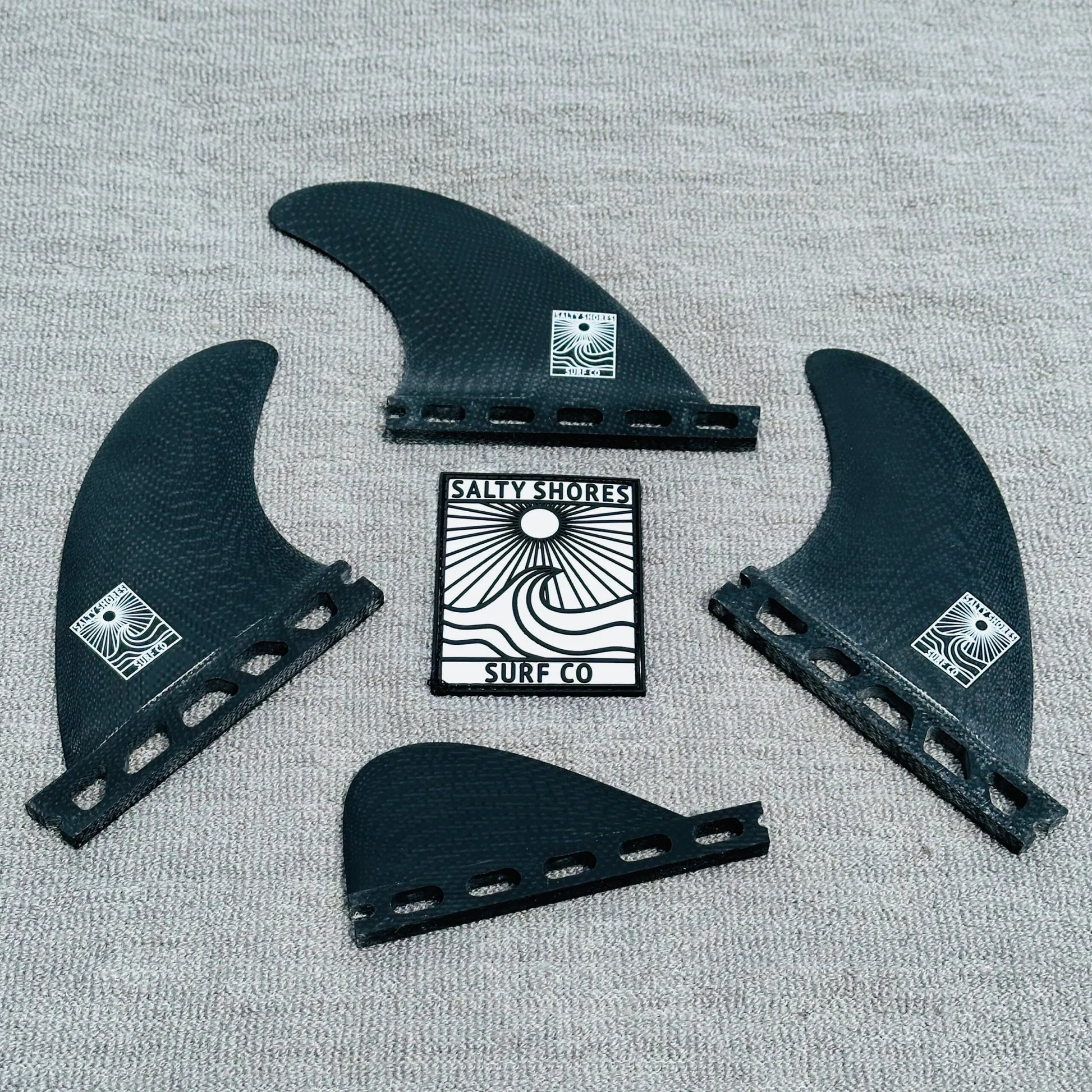 These Salty Shores Volan Black fins are all you need for a day of surfing. In one set you have thruster, twins, single fin standard and single nub. These Volan Black Thruster Fin sets are an extremely popular template with a retro look we had to make. They will deliver the fast and responsive surfing you are looking for while remaining your go to set for the whole boat!